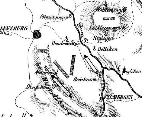Il était dix heures, lorsqu'après avoir franchi le défilé, l'armée prenait son ordre de bataille dans la plaine de Villmergen, à une portée de canon de la sortie du défilé et à la hauteur du petit village d'Hemmbrunn. Cette plaine, longue de trois quarts de lieue, bornée au couchant par les côteaux boisés de Dintikon et au levant par la Bunz, s'étendait jusqu'à Lenzbourg et à Ottmarsing, village sur la Bunz et dominé par le plateau du Meiengrun. C'était dans cette plaine que le Conseil de guerre voulait attirer l'ennemi, qui, supérieur en nombre, mais mal armé et sans cavalerie, devait perdre l'avantage que lui donnait le nombre, devant une bonne cavalerie et une infanterie très-manoeuvrière. L'armée, rangée sur trois lignes, chaque ligne à deux cents pas l'une de l'autre, faisait tête au défilé, déjà occupé par l'ennemi, et d'où il soutenait, avec nous, un feu assez vif, mais sans effet, vu la trop grande distance. Comme l'ennemi n'avançait pas et paraissait ou refuser le combat ou attendre que les brigades de Sonnenberg descendissent des hauteurs de Dintikon ou d'Ammerswyl, pour nous prendre par le flanc droit, l'armée faisait un à droite, et se mettait en marche, comme si elle battait en retraite sur Lenzbourg. Ce mouvement, couvert par la cavalerie, s'opérait dans le plus bel ordre; les colonnes marchaient en parade au son du tambour, et les canons dételés étaient traînés à la prolonge par des hommes pris dans les bataillons. Toutefois, Pfyffer restait immobile dans sa position, attendant que Sonnenberg eût effectué son mouvement. Mais, cédant aux clameurs de ses troupes qui demandaient à marcher sur un ennemi en retraite, il débouchait dans la plaine en avant d'Hemmbrunn. Alors, l'armée faisait face à l'ennemi et ouvrait le feu de toute son artillerie sur les colonnes de Pfyffer, qui se rejetèrent sur Hemmbrunn. Mais toujours menacée sur son aîle droite par Sonnenberg, qu'on voyait filer par les hauteurs dans la direction de Lenzbourg, l'armée faisait un second mouvement en retraite, puis un troisième pendant un quart de lieue. Enfin, elle faisait front, et se formait sur une ligne coupant toute la largeur de la vallée, dès les côteaux de Dintikon jusqu'aux marais de la Bunz, vis-à-vis du village de Dotikon. Le général Diesbach commandait l'aîle droite le général Manuel la gauche; l'artillerie et six escadrons étaient en seconde ligne.